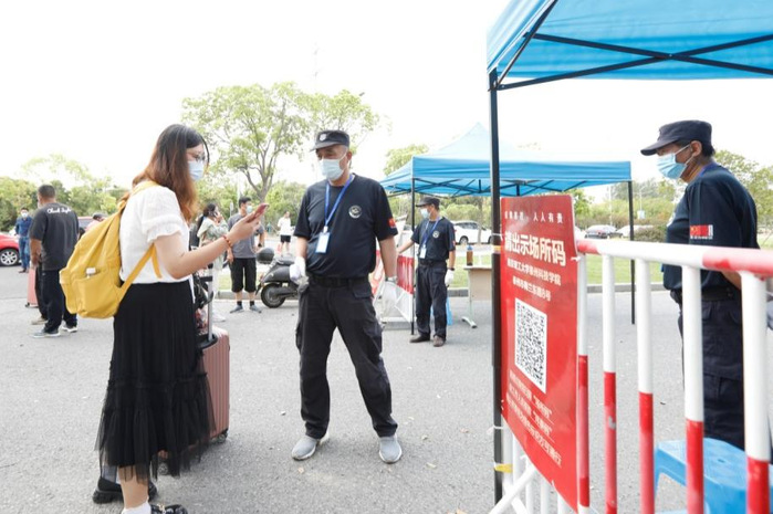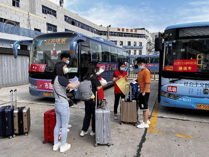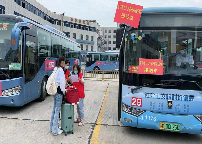 由于泰州正值省运会的特殊时期,为了实现闭环管理,不造成外地员工与泰州市社会面的交叉接触,本次返校,学校共派出了33辆大巴车,组织40余名远航突击队教师志愿者前往飞机场、高铁站、汽车南站,接送来自四面八方的返校员工。