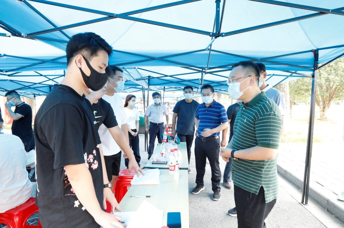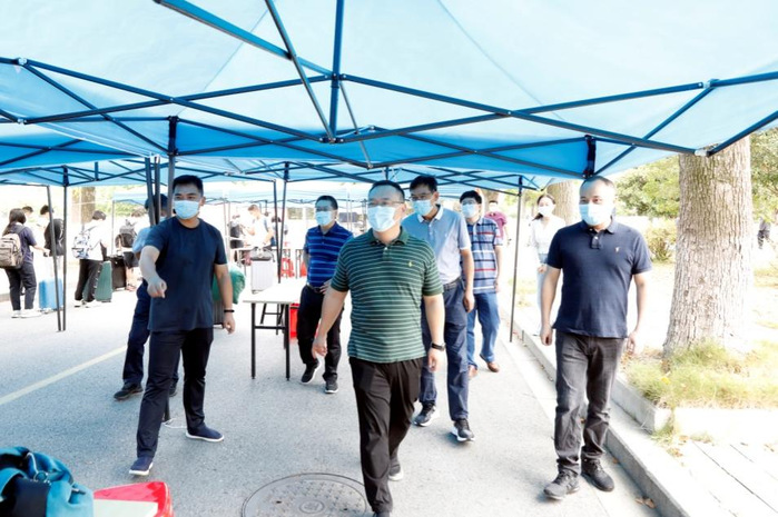 开学第一天上午,全体校领导及相关部门负责人来到南大门报到点,关心慰问现场师生,并与返校员工进行了亲切的交流。在南大门,校领导仔细察看了员工返校的各项流程、实时报到数据、应急预案落实等情况。