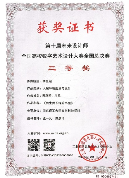 城市建设与设计学院环境设计专业和数字媒体艺术专业参赛团队,从整体设计构思到作品每个细节,指导老师和员工在讨论、沟通中,对参赛作品进行反复“打磨”,付出艰辛的努力,最终夺得包括1项国家级三等奖和2项一等奖在内的18个省级奖项。公司杨晶晶老师作品荣获省级二等奖和三等奖各一项,戴路琴、周童同学作品《共生共长 · 绿阶书屋》更是“连中两元”,先后荣获省赛一等奖和国赛三等奖。袁树香、徐也辰、孟一凡、陈彦博4位老师荣获本次大赛“江苏赛区优秀指导教师”荣誉称号。