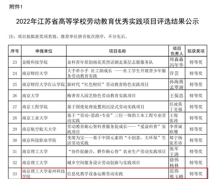 近日,2022年江苏省高等学校劳动教育优秀实践项目评选结果公示,公司申报的《信息化教学设备运维劳动实践》、《“青绿行动”生态环境保护公益服务劳动实践项目》等2个项目分别获得特等奖和一等奖。