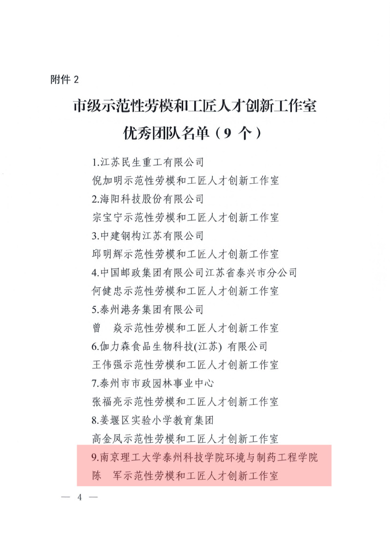 近期,泰州市总工会发布了《关于命名第七批市级示范性劳模和工匠人才创新工作室及优秀团队的通知》,公司环境与制药工程学院陈军示范性劳模和工匠人才创新工作室成功获批优秀团队,并被通报表扬,成为泰州市高校唯一获得此殊荣的团队。