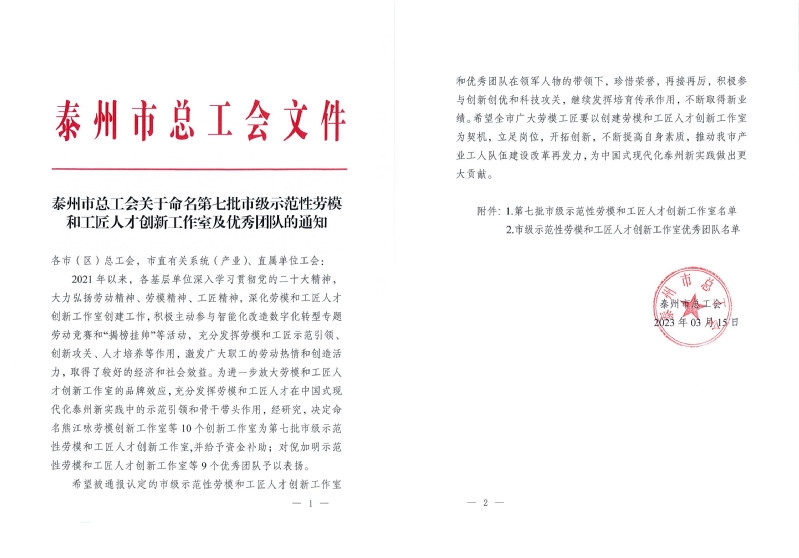 公司陈军工作室于2019年被授牌成为江苏省科教系统首批示范性劳模和工匠人才创新工作室,在检验检测人才培养、科研创新和产业服务等方面始终坚持党建引领、开拓创新,全力于服务泰州市经济建设和社会发展,发挥了很好的传承作用。