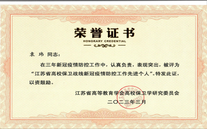 近日,在江苏省高教学会保卫研究会第十届二次理事会暨2022年学术年会活动中,公司后勤保卫处袁玮、秦海金同志被江苏省高等教育学会高校保卫学研究委员会评为“江苏省高校保卫战线新冠疫情防控工作先进个人”。