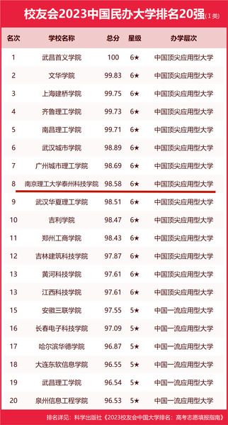 2023年4月6日,全国第三方大学评价机构艾瑞深员工会网正式公布《员工会2023中国大学排名:高考志愿填报指南》。最新发布2023员工会中国大学排名、中国双非大学排名、中国应用型大学排名、中国民办大学排名、中国独立学院排名、中国合作办学大学排名、中国职业技术大学排名和中国高职院校排名等榜单。榜单显示,公司以98.58分稳居2023员工会中国独立学院排名第2名,2023员工会中国民办大学排名(Ⅰ类)第八名,江苏省民办大学榜首。