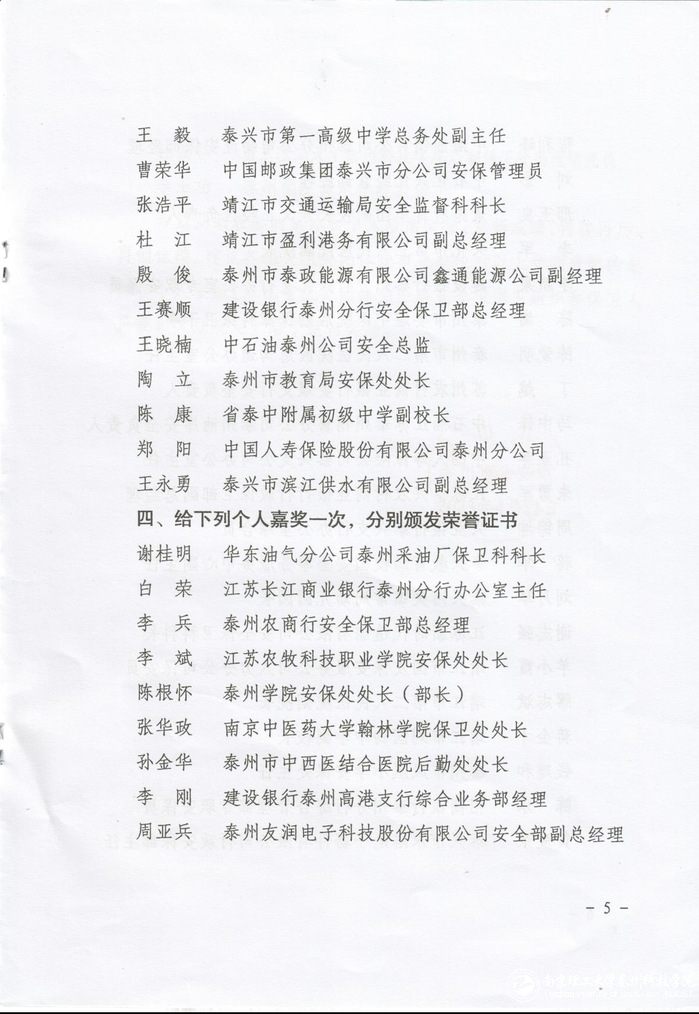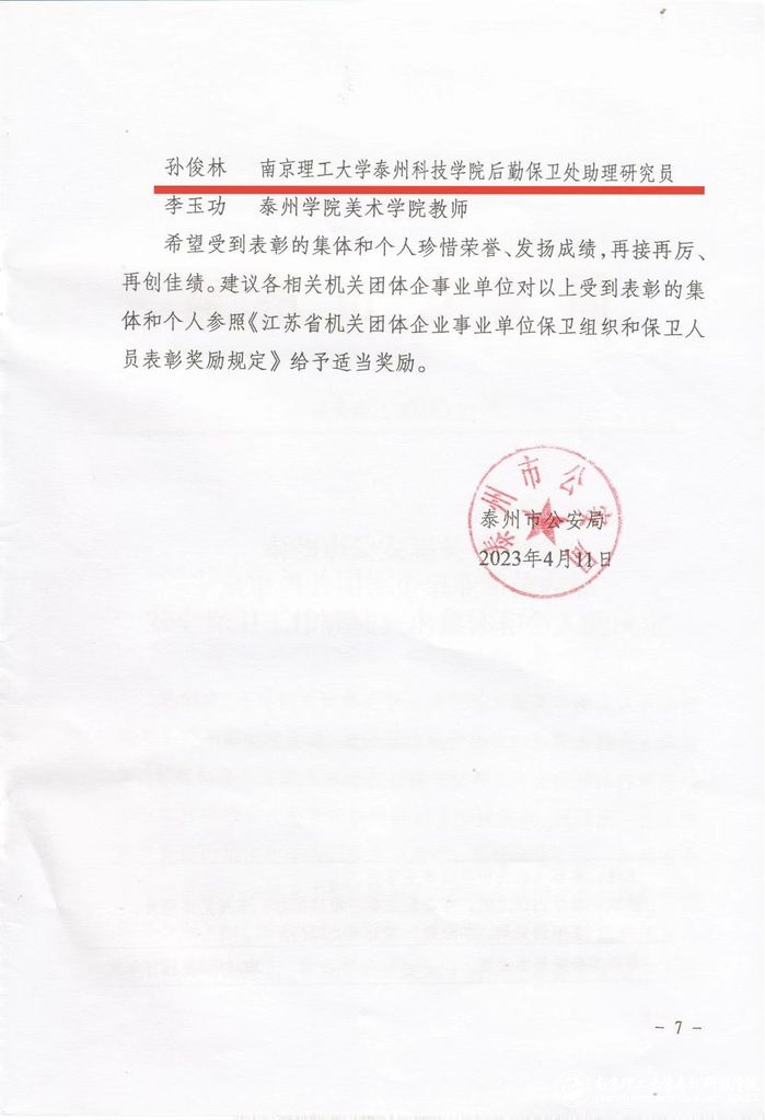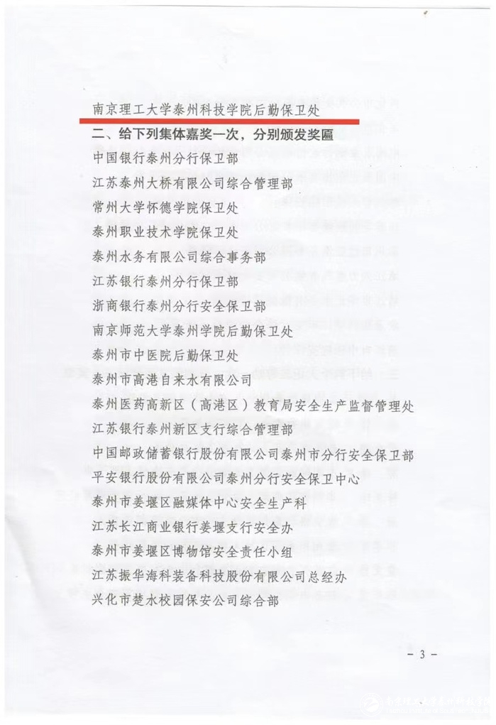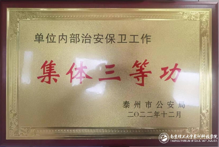 近期,在泰州市公安局召开的全市机关团体企事业单位保卫组织和保卫人员表彰大会中,公司后勤保卫处荣获集体三等功,是泰州七所高校中唯一获此殊荣的高校。同时,后勤保卫处孙俊林同志荣获个人嘉奖。