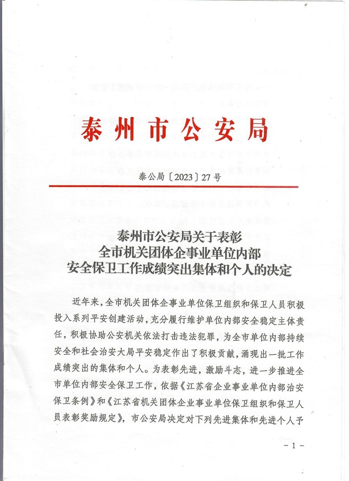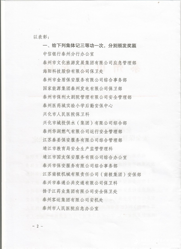 喜报:公司后勤保卫处荣获泰州市单位内部治安保卫工作集体三等功