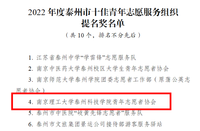 近日,共青团泰州市委、市青年志愿者协会公布了2022年度全市青年志愿者行动评选结果,公司罗俞权、罗燕2名同学获得“泰州市优秀志愿者”称号,公司青年志愿者协会获得了“泰州市十佳青年志愿服务组织提名奖”。