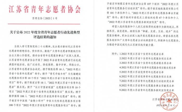 喜报:公司在2022年度江苏省青年志愿者行动中获得多项荣誉