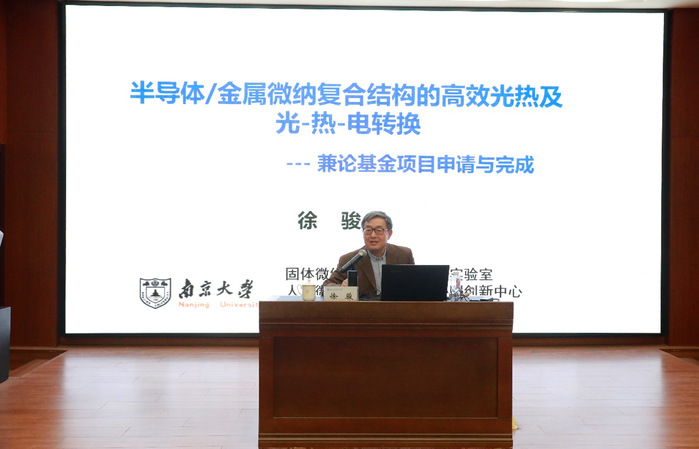 徐骏以“半导体/金属微纳复合结构的高效光热及光热电转换”国家自然科学基金重点项目为例,围绕如何从自己的研究基础出发提出项目题目,如何瞄准前沿方向找准关键科学问题,如何针对关键科学问题厘清研究内容和技术路线,在获得基金支持后如何围绕研究目标开展相关研究等,与在座的师生做了细致的分享。