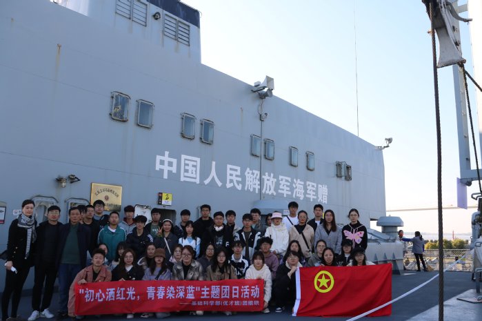 观巍峨舰艇,铸海军荣光。走进泰州海军舰艇文化园,三艘威风凛凛的军舰映入眼帘。基础科学部(优才班)22级团员青年们上甲板、登舷梯,依次参观“881洪泽湖号补给舰”“108西宁号导弹驱逐舰”“515厦门号导弹护卫舰”,近距离观察舰艇上相关设备,了解海军官兵在舰艇上的工作和生活环境,聆听人民海军在泰州白马庙诞生以及由弱到强发展壮大并驶向祖国万里海疆的介绍。