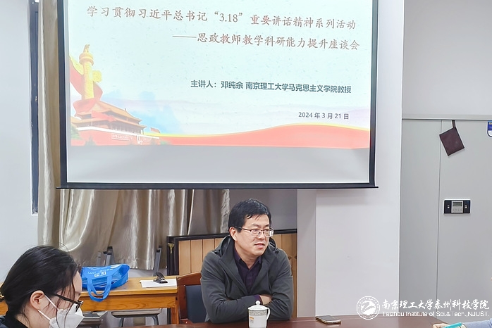 座谈会上,与会人员重温了习近平总书记“3·18”重要讲话精神,邓纯余教授作了精彩的专题辅导。他表示,在“3·18”重要讲话发表5周年之际,应邀前来参加南泰科马研部这次座谈会感到非常高兴。讲话中,邓纯余教授围绕“教科研一体化”“大中小学思政课一体化”等话题分享了科研方法、教学经验、提升路径,引导思政课教师准确把握“理直气壮开好思政课”的实质内涵,指导思政课教师以教科研为引领,立足教材做教研、立足教研搞科研、立足科研谋特色,从问题出发探寻课堂话题、教学主题、科研选题,多渠道提升教师专业素质,做培根铸魂的“大先生”。