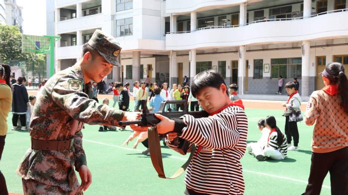 在24日下午主题活动课上,公司国旗护卫队教官班代表为孩子们带来了关于95式自动步枪的讲解。他们通过生动的语言和形象的展示,向孩子们介绍了95式自动步枪的结构、性能和据枪动作,让孩子们对这款国产步枪有了更加深入的了解。教官们还组织了有趣的互动游戏及红歌嘹亮环节,让孩子们在互动中体验到了军事训练的乐趣,在轻松愉快的氛围中巩固了国防教育。