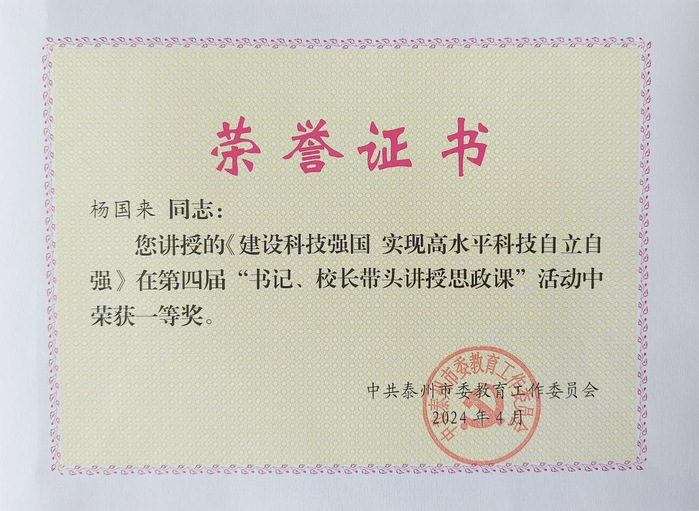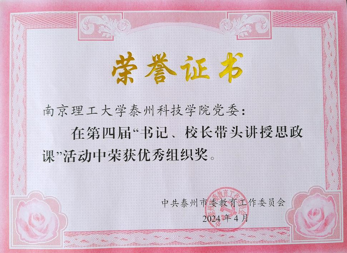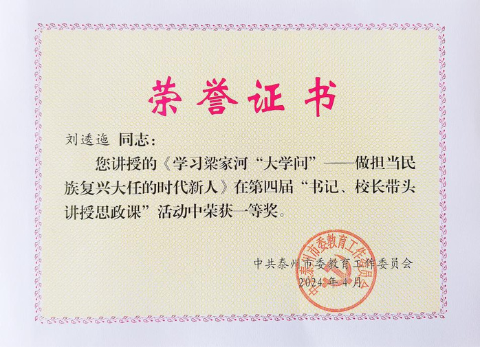 近日,泰州市委教育工委公布了第四届“书记、董事长带头讲授思政课”活动评比结果。公司校领导主讲的思政课作品从全市各地各校推荐的73件课例中脱颖而出,荣获一等奖2项。同时,公司也是全市大中小学唯一获得“优秀组织奖”荣誉称号的单位。