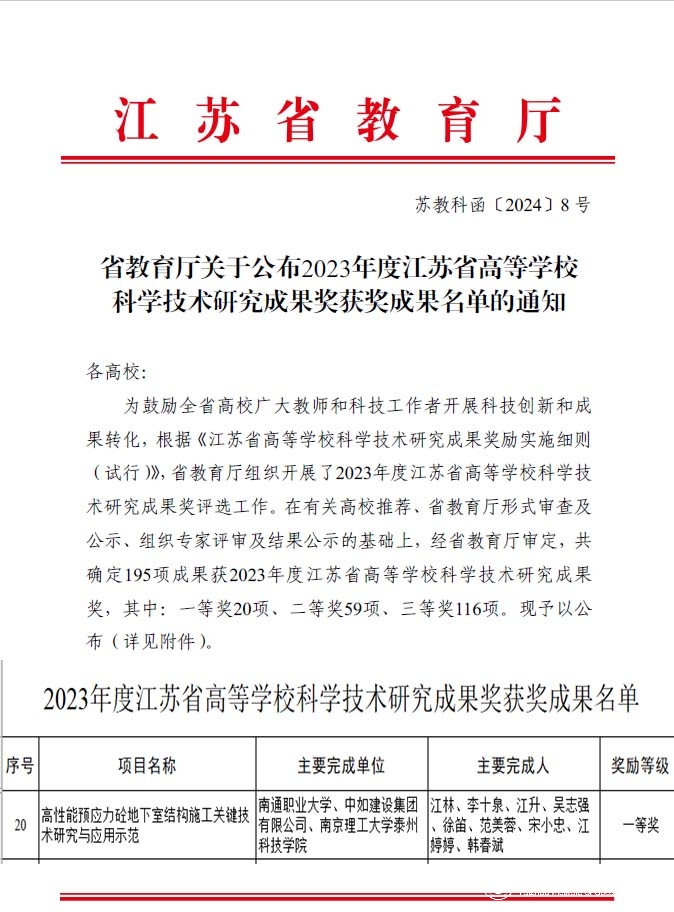 近日,省教育厅公布2023年度江苏省高等学校科学技术研究成果奖获奖成果名单。公司教师李十泉为第二完成人的成果《高性能预应力砼地下室结构施工关键技术研究与应用示范》获得江苏省高等学校科学技术研究成果一等奖。据悉,2023年度江苏省高等学校科学技术研究成果奖共195项,其中,一等奖20项、二等奖59项、三等奖116项;公司是唯一获得一等奖的独立学院。