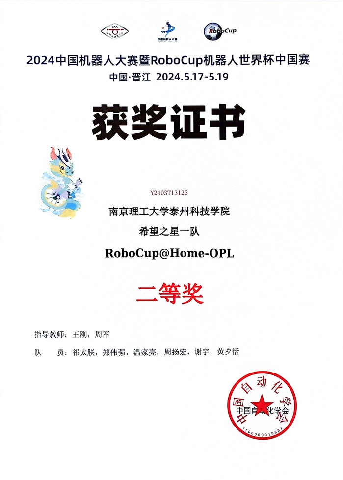 5月16至19日,2024 RoboCup机器人世界杯中国赛在福建晋江国际会展中心成功举办。在公司王刚、周军等老师悉心指导下,参赛师生奋力拼搏、克服重重困难,通过校赛选拔优秀队伍参加国赛,经过激烈角逐,公司学子首次参赛夺得RoboCup@Home-OPL赛项全国总决赛二等奖1项。