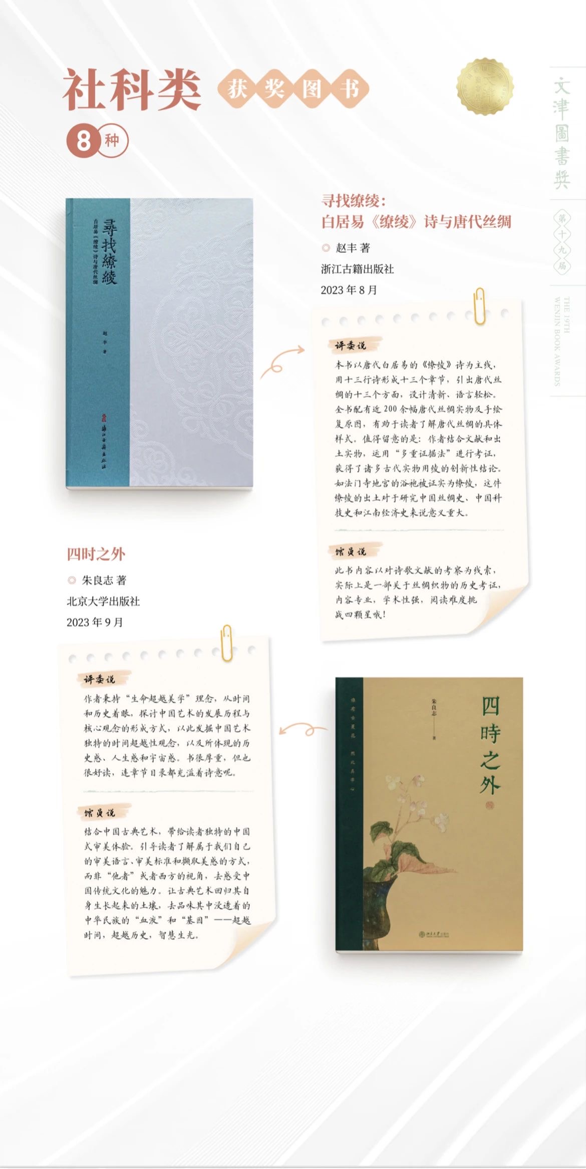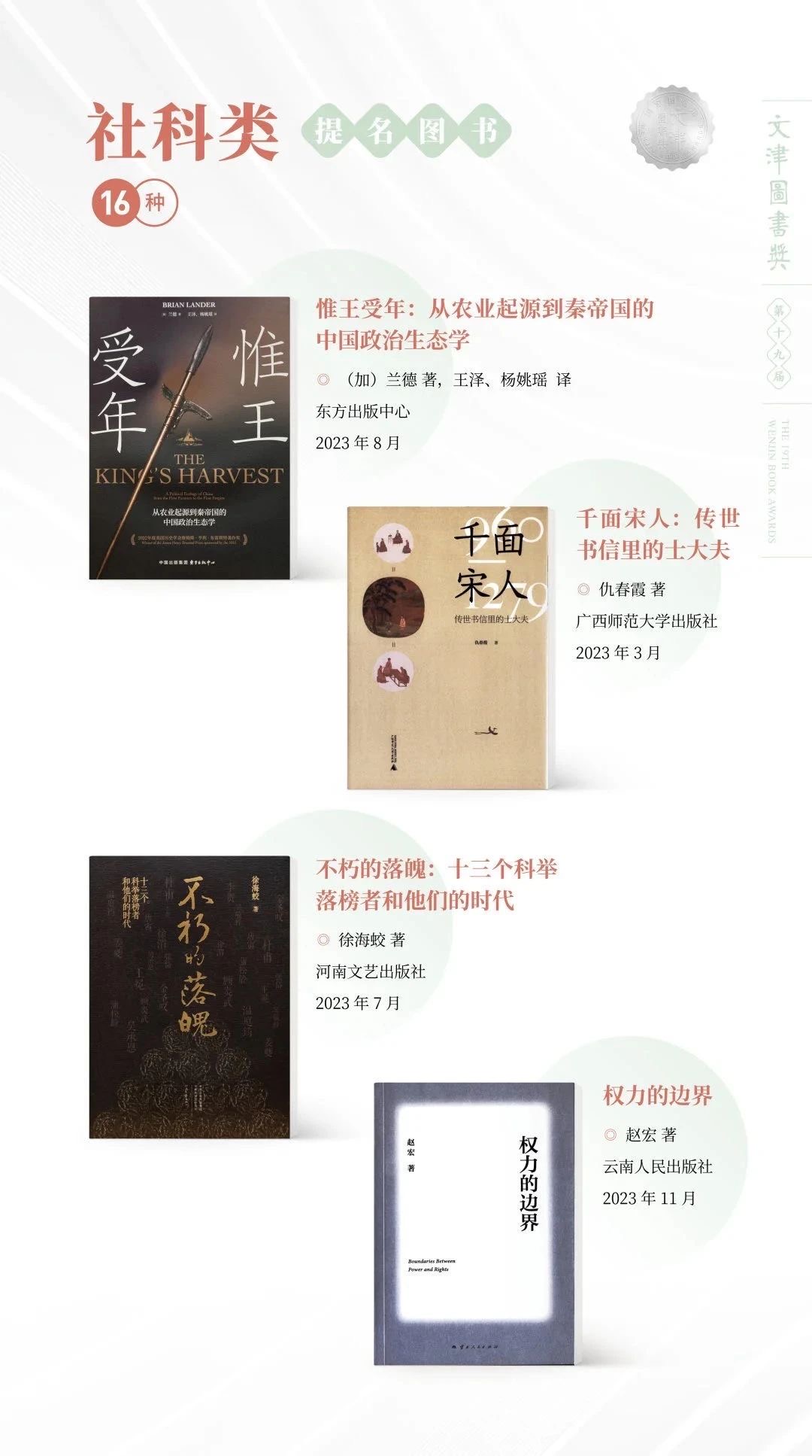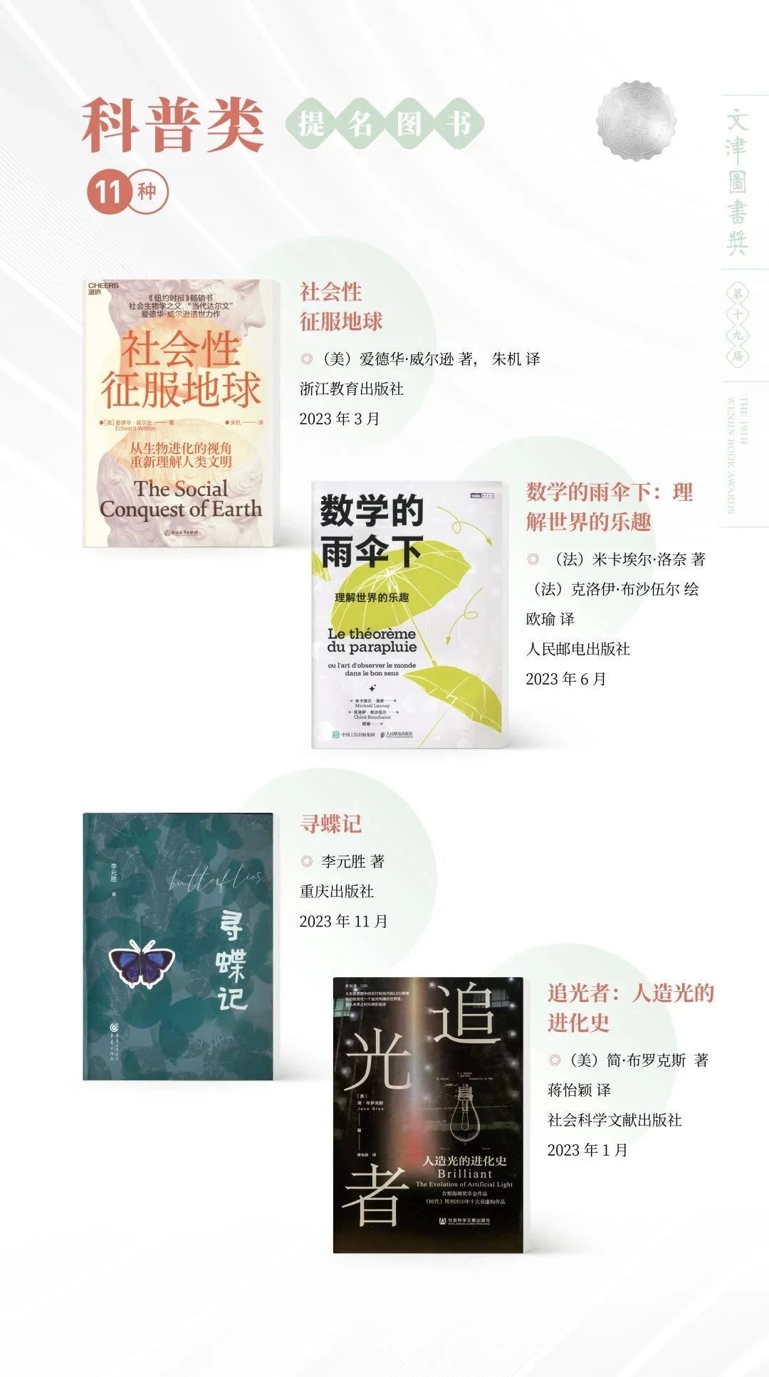第十九届文津图书奖揭晓,奖历时近五个月的推荐、讨论与评审,最终发布文津图书奖图书20种,提名图书41种。威廉希尔第十五届书香校园建设系列活动期间,图书馆推出第十九届文津图书奖获奖图书线上展览,展出社科类、科普类获奖图书及提名图书,诚邀广大师生品读优秀作品,感受文化魅力。