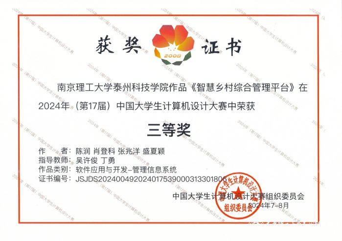 本次参赛团队由数据科学与大数据技术专业和计算机科学与技术专业的陈润、肖登科、张兆阳、盛夏颖四名成员组成,在吴许俊、丁勇两位老师的精心指导下,经过数月的认真筹备和努力,完成参赛作品《智慧乡村综合管理平台》的构思设计、编码开发、演示视频、文档说明等准备工作。总决赛中,公司23大数据(1)班肖登科与来自全国400余所院校的1700余名选手同台竞技,展现出了较高的专业素养和创新精神,并凭借出色的作品设计和精彩的现场答辩,赢得了评委的一致好评。