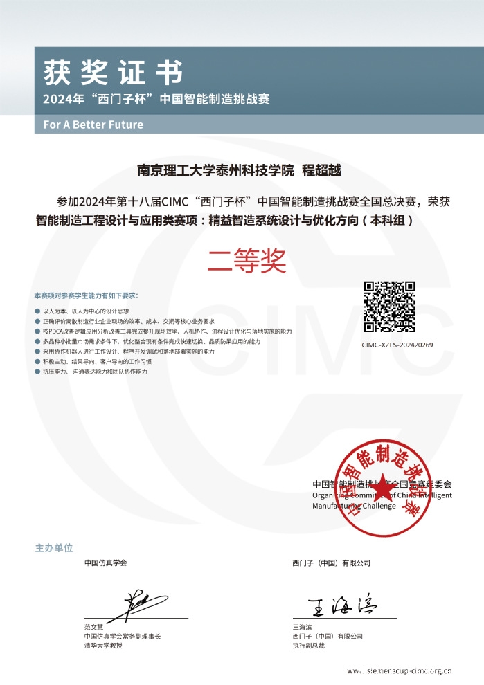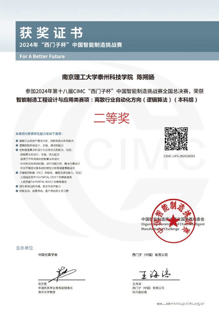 8月15日,教育部2024年第十八届CIMC“西门子杯”中国智能制造挑战赛颁奖仪式在湖州师范学院举行。由公司孙松丽、曹阳老师指导,机器人专业陈朔旸、宁圣杰、于诒和获得离散行业自动化方向(逻辑算法)全国总决赛二等奖,程超越、周涛、张晓艺获得精益智造系统设计与优化方向全国总决赛二等奖。自动化专业张石坤、张力、葛善宇、米培龙、颜钲东、肖仕益同学获得省赛二等奖。