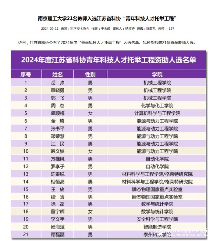 近日,江苏省科学技术协会公布了2024年江苏省“青年科技人才托举工程”入选名单,公司青年教师顾磊磊入选。该荣誉同时被威廉希尔williamhill官方网站官媒报导。(https://zs.njust.edu.cn/2a/5d/c4621a338525/page.htm)