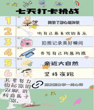 10月10日至10月20日,校心理协会举办了“七天打卡——用行动摆脱焦虑”的活动。在这七天里,同学们积极参与,通过打卡的方式记录自己的心理成长历程。有的同学选择聆听音乐,放松身心,缓解压力;有的同学坚持运动打卡,用汗水释放负面情绪;有的同学通过拍照书写,记录下生活中的小确幸;有的同学走进自然,用带有桂花香气的微风,洗涤内心;还有的同学通过阅读书籍,了解心理知识,不断充实自己的内心世界;活动结尾,参与的同学们分享了自己在七天打卡中的收获和感悟。通过活动,同学们加深了对自己情绪的理解,并学会了更多减压和情绪管理的方法,提升的自己的心理健康素质。