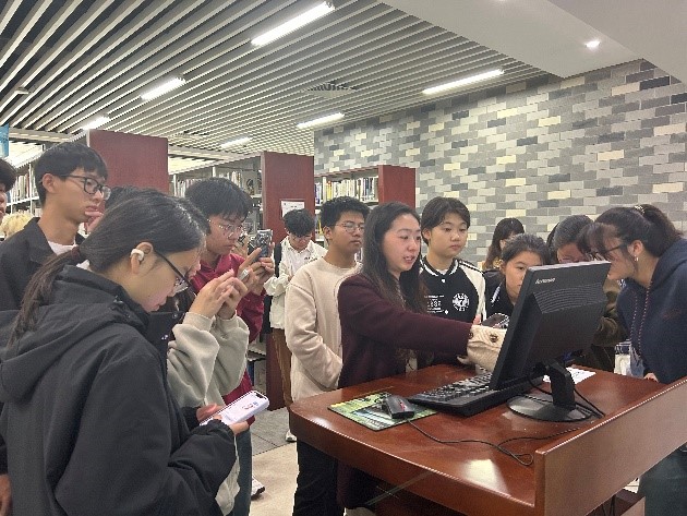 首先,读者服务部蒋金人老师带领同学们实地参观,逐一了解了图书馆的各个功能区,开启图书馆发现之旅。在服务总台、各个书库,蒋老师向同学们详细讲解图书借阅规则和书库布局,现场指导同学们使用查询机使用、办理借阅手续以及在移动客户端查询和利用图书馆资源;在期刊阅览室、自主学习中心,蒋老师为同学们介绍图书馆报刊阅览规则和座位预约规则,让新生们在实地对图书馆的规章留下印象、将图书馆空间功能使用流程记在心上。书香萦绕之间,新生们对图书馆的馆藏资源、设施设备以及相关规章制度有了全面的认知,为其日后高效利用图书馆开展学习、科研活动,奠定了良好基础。