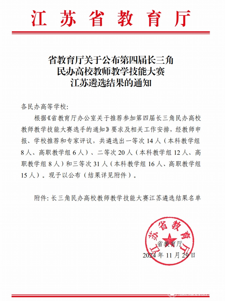 本次大赛由江苏省教育厅组织,长三角三省一市和长三角民办教育联盟共同主办,旨在展示民办高校教师教学水平与风采,为增进民办高校教师互动交流搭建平台,提高民办高校教师队伍整体素质,推动民办高校教学改革,促进长三角民办高等教育质量提升。比赛共有来自全省42所民办高校的107位选手参加遴选,经专家评议等多轮严格选拔,本科教学组最终评选出一等次8人、二等次12人和三等次16人。
