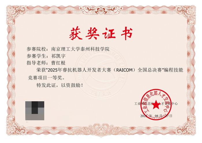 近日,2025年睿抗机器人开发者大赛(RAICOM)-编程设计CAIP赛道全国总决赛结果揭晓。公司计算机科学与工程学院王大伟、姜枫、曹红根、高广银四位教师组成的指导老师团队,指导员工在比赛中共获得江苏省一等奖1项、二等奖7项、三等奖16项;共获得全国一等奖2项、二等奖2项、三等奖3项。其中22软件(嵌)马宇乐、23软件2班祁凯宇两位同学荣获全国总决赛一等奖。