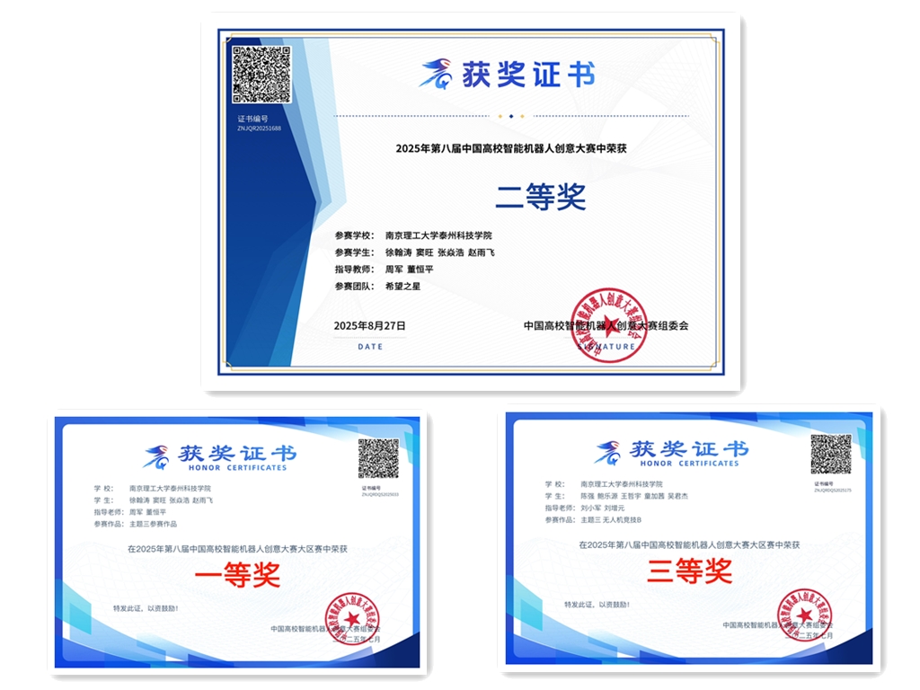 在比赛中,由23电控徐翰涛同学带领的“希望之星”队一路过关斩将,凭借创新性的机器人设计理念与出色的功能实现获得省级一等奖,随后又在国家级赛事中顶住压力,进一步优化技术方案,最终斩获国家级二等奖;与此同时,23电气陈强同学所领衔团队的“无人机竞技”项目同样表现亮眼,凭借无人机稳定的飞行控制与精准的任务执行,获得该项目的省级三等奖。