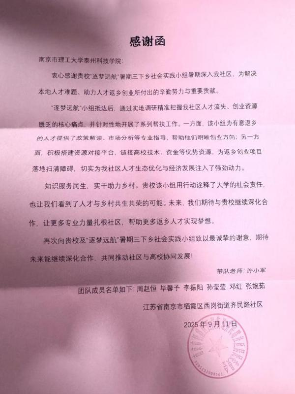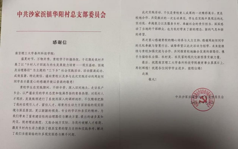 实践小分队的暑期实践活动得到各地好评。收到了两封来自江苏省南京市栖霞区西岗街道齐民路社区和中共沙家浜镇华阳村总支部委员会的感谢函,感谢公司“逐梦远航”暑期三下乡社会实践小组为解决社区人才难题、助力人才返乡创业所做的调研、指导及资源对接等工作,并期待深化合作。