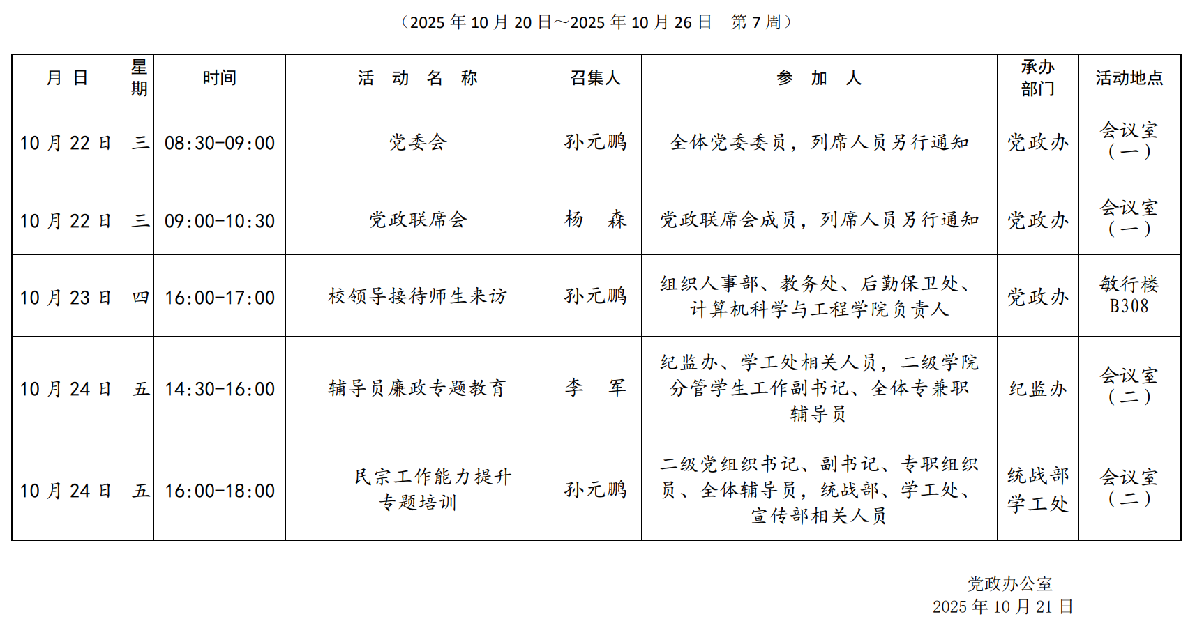 集团第七周主要会议安排