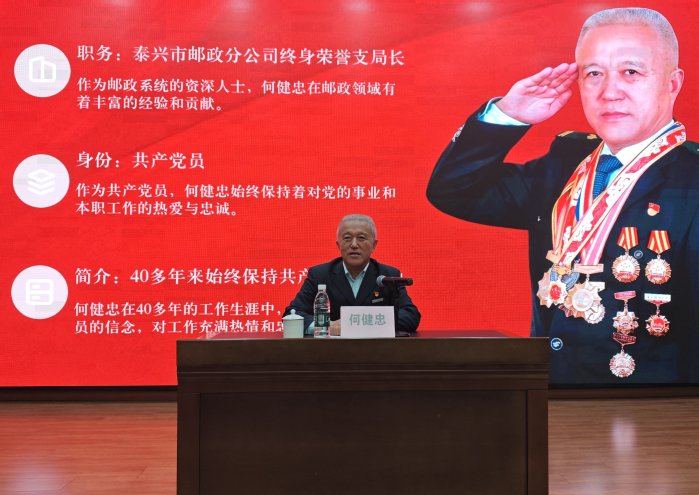 何健忠是泰兴市邮政分公司终身荣誉支局长,一位从基层成长起来的全国模范。他集全国人大代表、全国劳动模范、全国优秀共产党员、“中国好人”、“全国最美退役军人”等荣誉于一身,其“您打电话,剩下的事我来办”的24小时服务承诺,已成为深入人心的服务品牌。