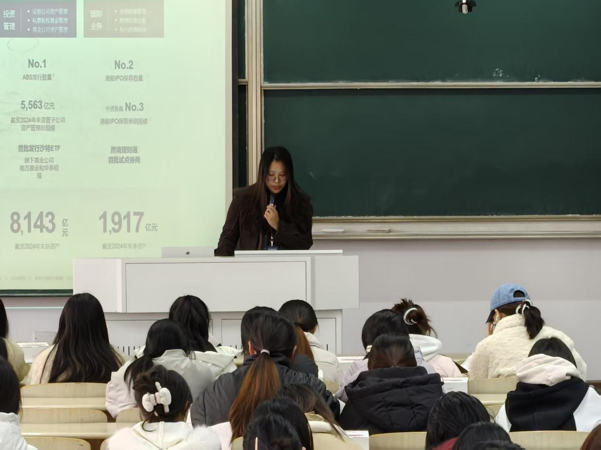 宣讲会上,企业代表肖蓓蓓结合自身八年从业经历,分享了从非专业背景、性格内向的起步阶段,到逐步成长为业务骨干的历程。她特别提到,公司完善的新人培养与陪伴机制,为员工提供了持续学习和专业重塑的平台。随后,宣讲团队系统介绍了华泰证券自1991年成立以来的发展脉络——作为沪、港、伦三地上市的综合型券商,公司在多项业务中处于行业领先地位,并建立了从投资顾问到管理岗位的清晰晋升通道,彰显出企业对人才成长的高度重视与长远规划。