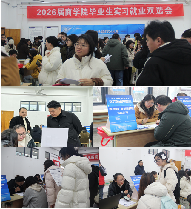 为落实党中央、国务院关于高校毕业生就业工作的决策部署,搭建人才供需对接桥梁,促进毕业生高质量充分就业,12月22日,商学院联合海陵区人力资源和社会保障局举办的“校企协同育人对接暨2026届毕业生就业专场招聘会”在公司举行。泰州市海陵区人社局就管中心副主任乔静、就业市场负责人陆海霞、商学院经理许小军、党总支书记顾云海、党总支副书记兼副经理陈小强、副经理张琴、副经理曲国明、各专业负责人及25家用人单位参加了活动,活动通过“对接会+招聘会”双轨并行模式,搭建起政校企协同育人的实习就业服务平台,为助力公司毕业生顺利实习就业铺就“快车道”。