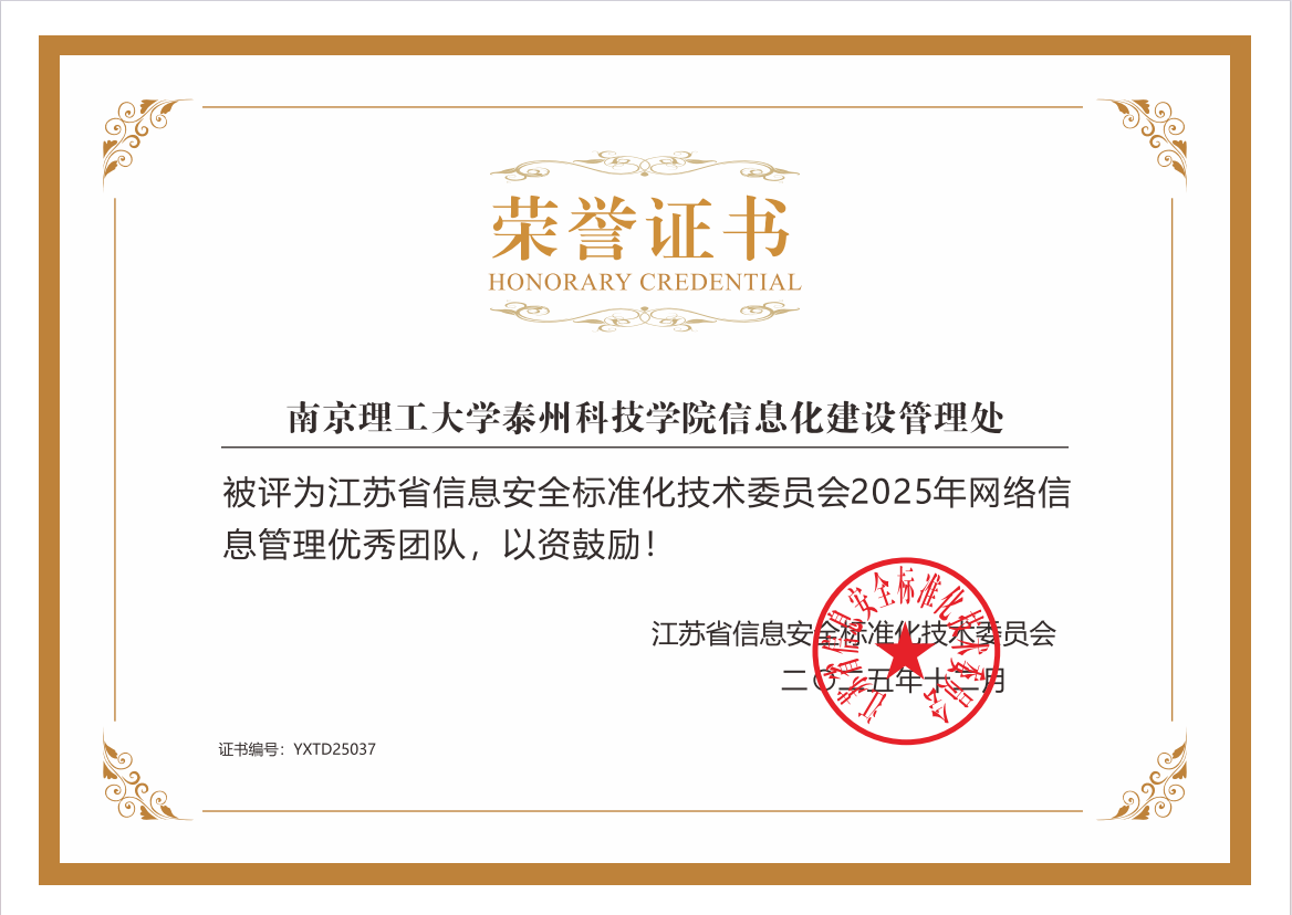 近日,在江苏省高校网委会组织的年度优秀评选中,公司信息化建设与管理处(简称“信管处”)荣获“江苏省信息安全标准技术委员会2025年网络信息管理优秀团队”称号。