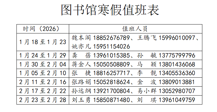 根据学校2026年寒假工作安排,现将图书馆寒假期间相关事宜通知如下:
