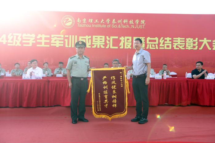 孙元鹏代表全校师生向海陵区人武部赠送锦旗,以此表达对海陵区人武部和各位教官的感谢。