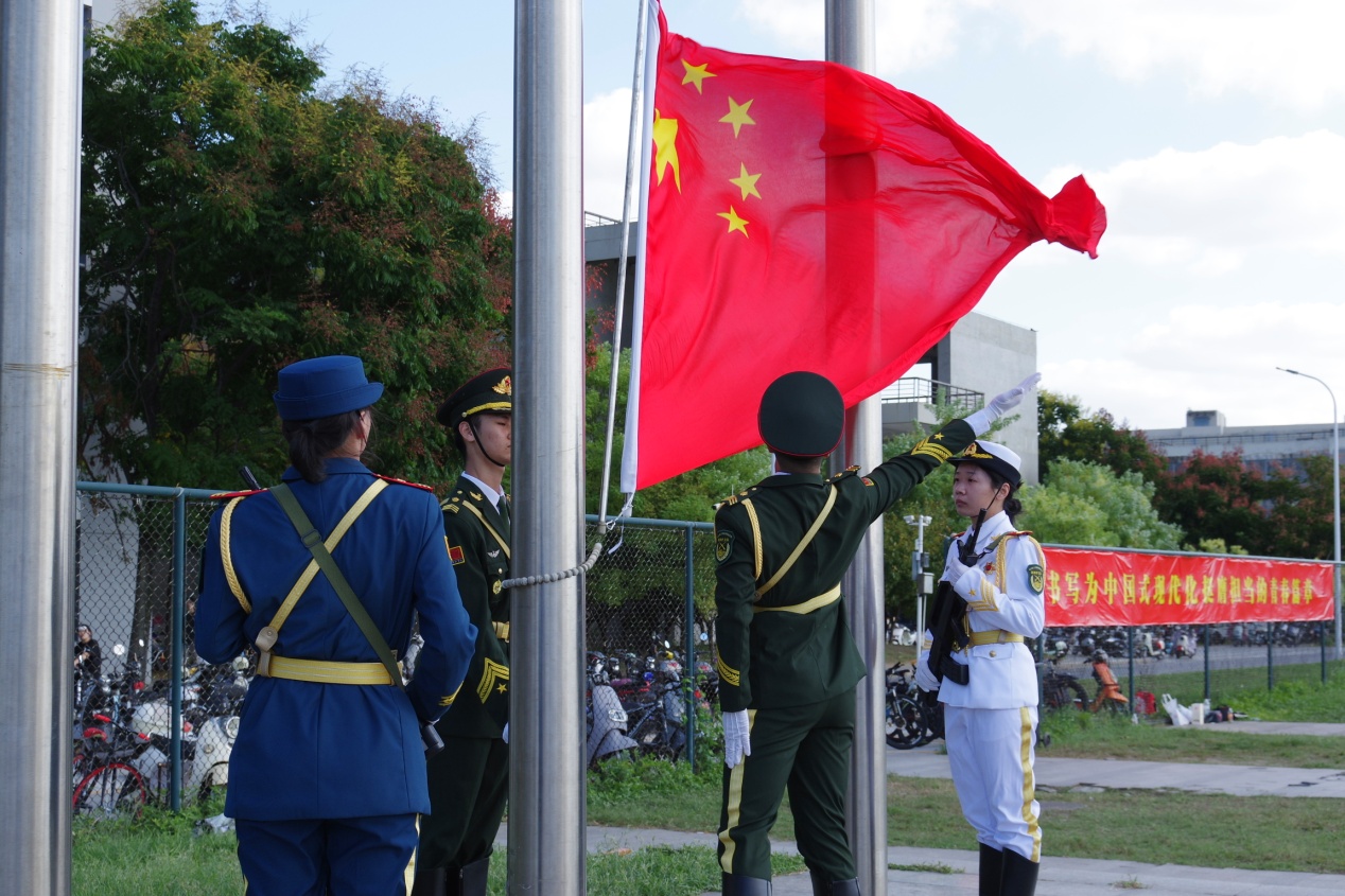 国旗护卫队迈着整齐划一的步伐,护送国旗走向升旗台。庄严的国歌奏响,升旗手迎风振臂,鲜艳的五星红旗冉冉升起。全体参会人员肃然起立,面向国旗行注目礼。
